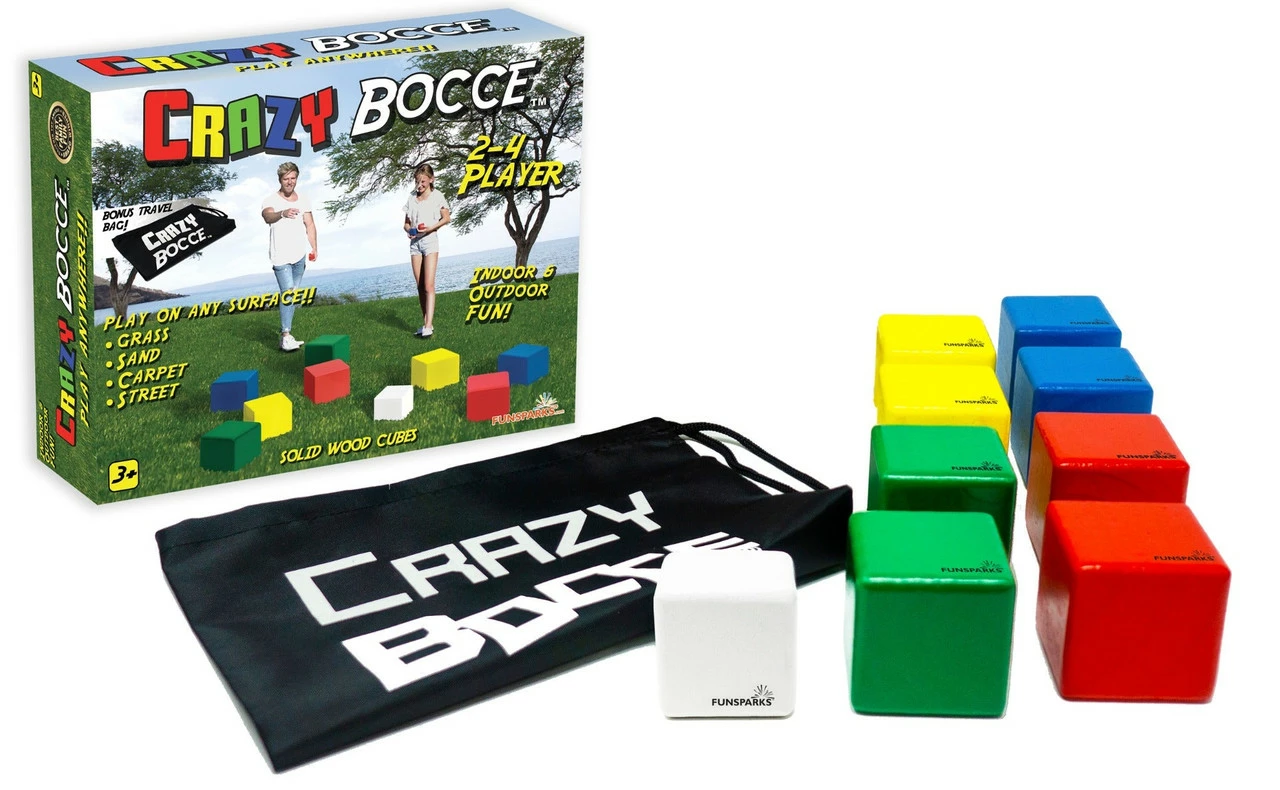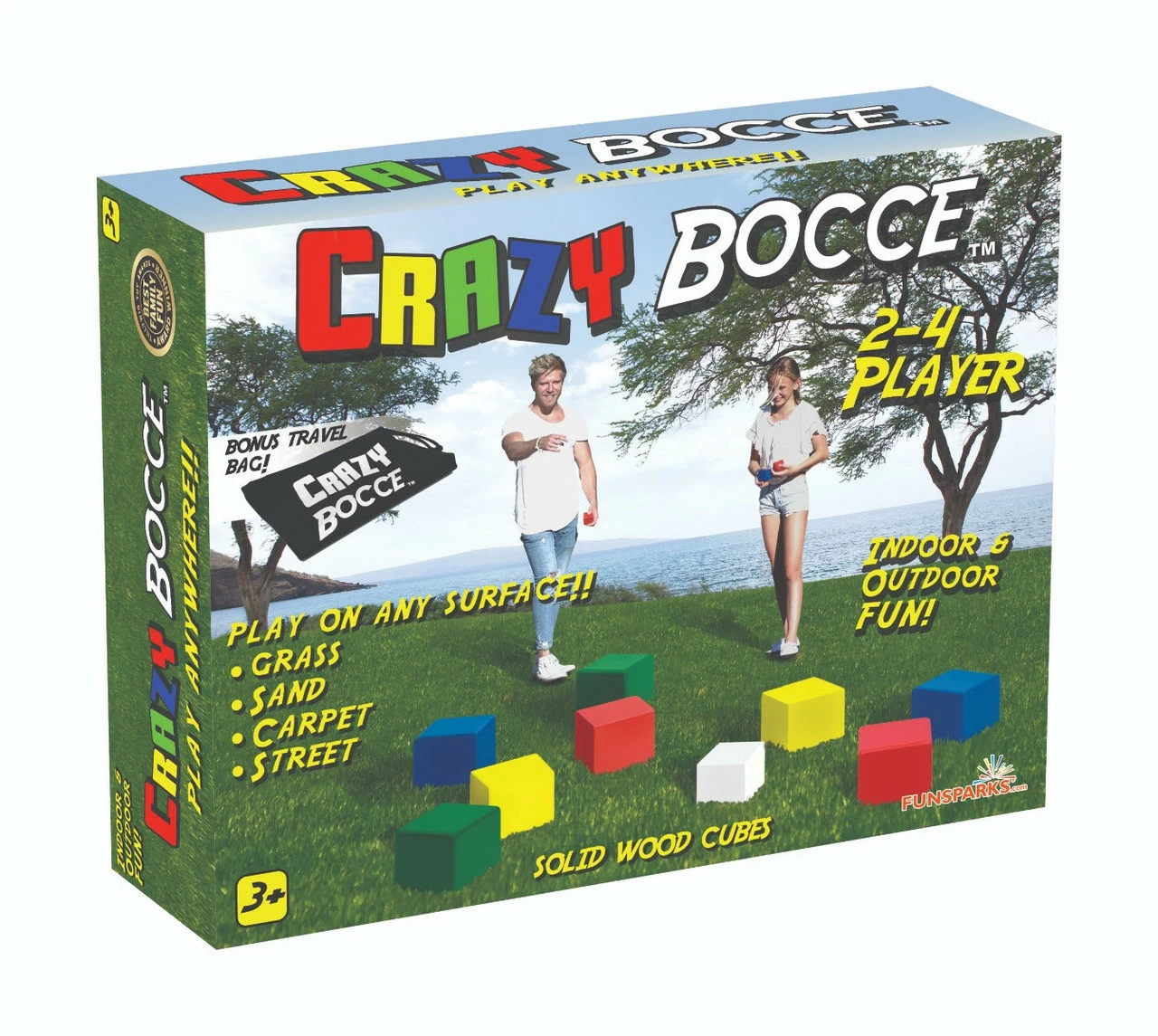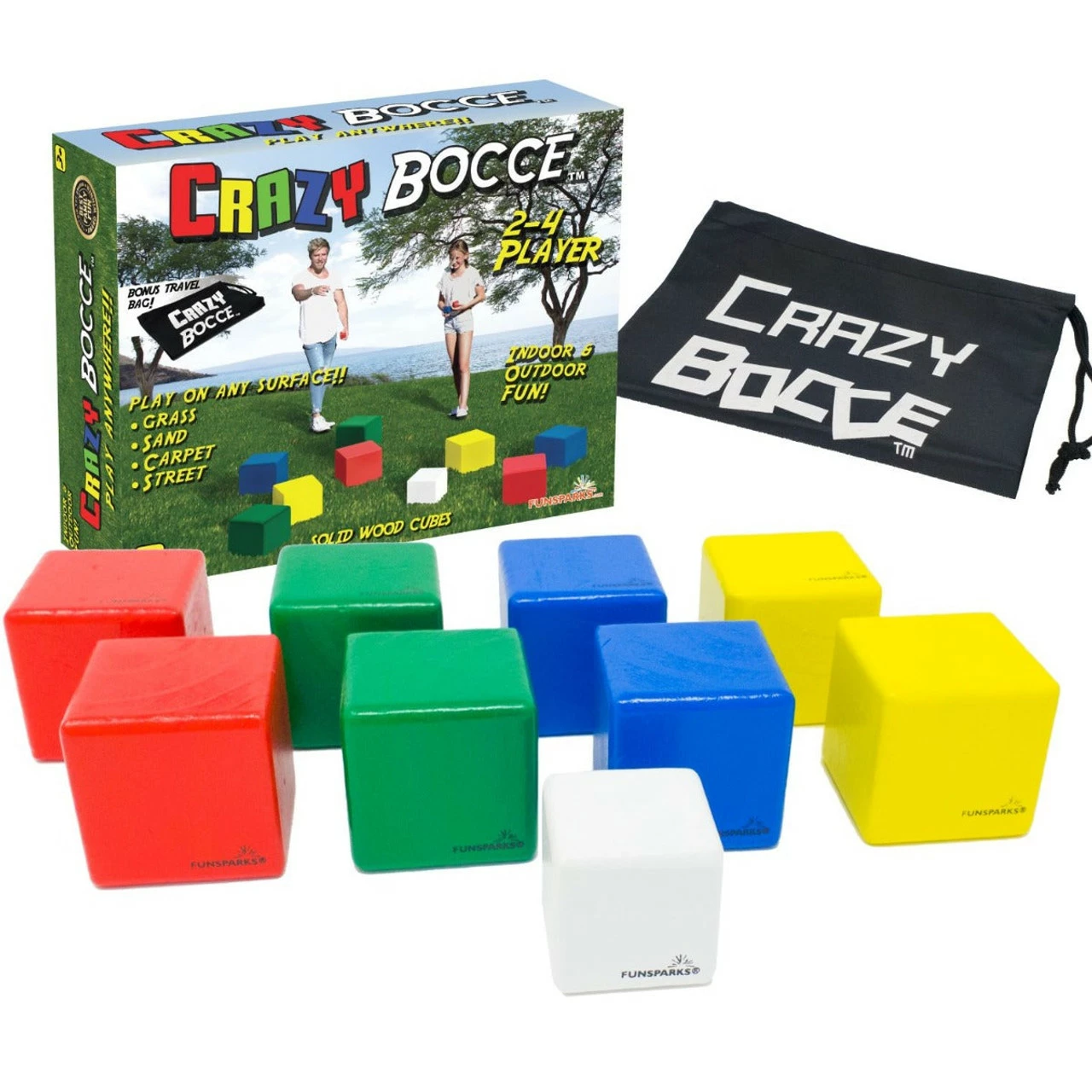 FUN FOR EVERYONE – This go-to complete classic summer sport can be enjoyed by kids, teens, and adults. Bocce Ball is generally played on outdoor surfaces such as grass, sand, or dirt however, Crazy Bocce has revolutionized the game with cube blocks allowing you to play justy about anywhere, including driveways, roads or any sloped surface as they wont slide PLAY ANYWHERE – This set is easy to play on your own lawn or take to the beach, barbecue party, or to the neighbor"™s yard. QUALITY MATERIALS – Crazy Bocce is made with solid durable wood that will last. SET INCLUDES – 2 red, 2 yellow, 2 green, 2 blue cubes and 1 pallino ball SATISFACTION GUARANTEED "“ Funsparks committed to providing consumers with the absolute best price and value on our entire line of products. Crazy Bocce is a new take on a classic game, no more worrying about slopes! This game can be played virtually anywhere including driveways, roads, parking lots and much more. Great game for kids, adults, and truly fun for people of all ages. Bringing along a set to play is sure to liven up any beach day, backyard get-together, or outdoor party and provides entertainment for your family and friends for memories that will last a lifetime.