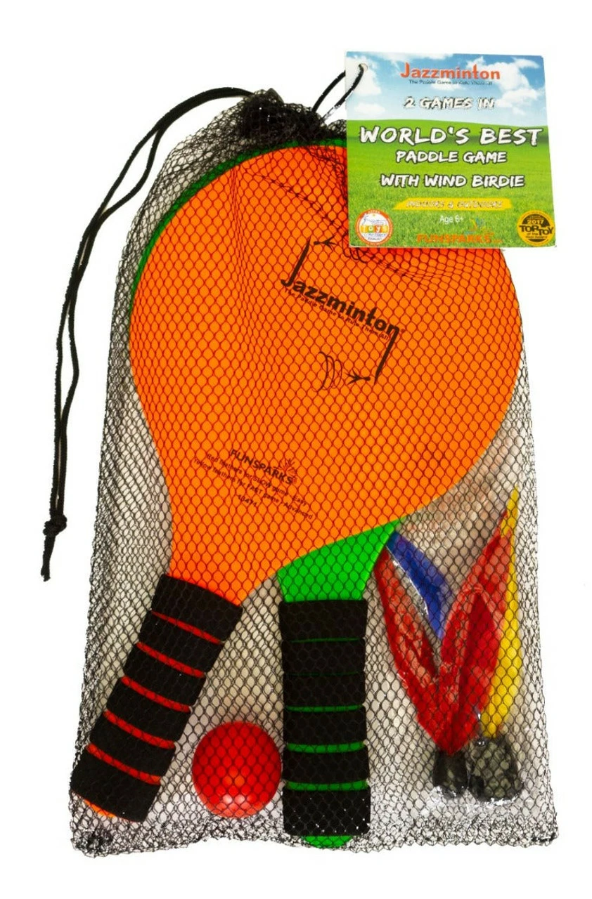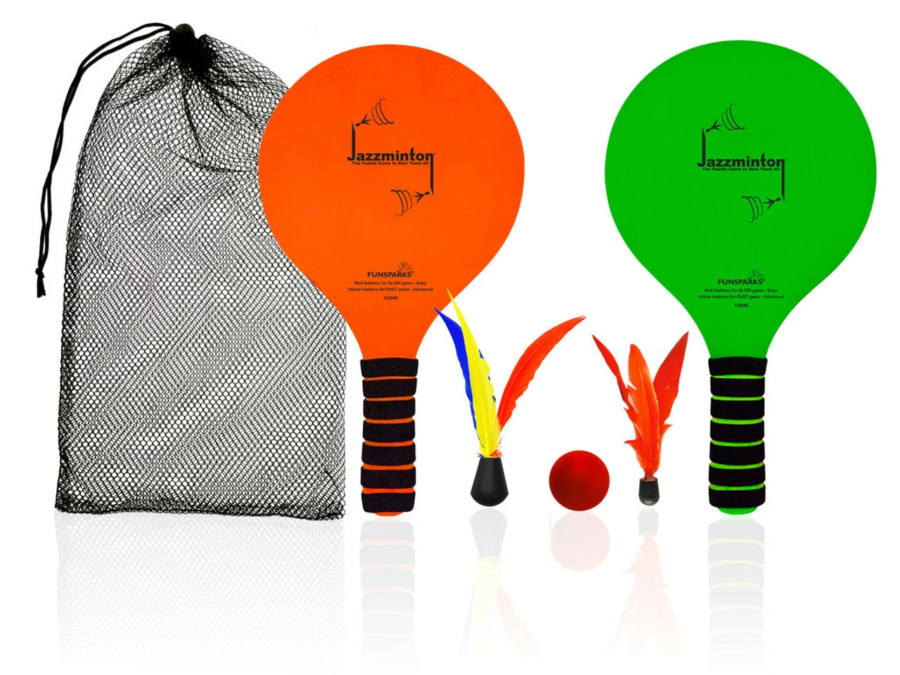 FULL SET INCLUDES: 2 fluorescent wooden paddles, 1 wind birdie, 1 strong ball and 1 red birdie for slow play, as well as a durable carry bag QUALITY MATERIAL: Paddles are 7-layer plywood with water resistant paint and moisture wicking soft rippled foam grip handles for comfort WIND SHUTTLECOCK: Real goose-feather birdie allows you to play well in strong wind with all your friends and family EXCELLENT CHOICE – WHY: Jazzminton paddle ball has 5 versions for whatever occasion; indoor, outdoor or windy conditions you are looking for BUY WITH CONFIDENCE: We take pride in our customer service; any broken piece or just generally unhappy with the product, we will replace it fully or refund and no questions asked Funsparks Jazzminton Beach is perfect for just that, the beach. This set comes with 2 birdies, 1 that is made for windy days and one for a slower more relaxed game, 1 ball and a reusable drawstring carry bag to store all of the pieces. The feathers are attached using a special water-resistant glue to ensure cohesion when playing by the beach, pool or in the rain. This game is excellent for beginners or veterans alike as you can play fast or slow, with a choice of a variety of birdies. Rally back and forth or set and spike your way to a competitive game, no matter what this game is loads of fun for all ages!