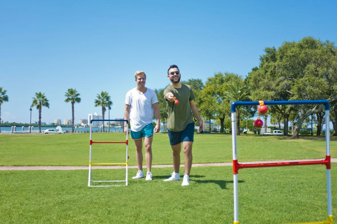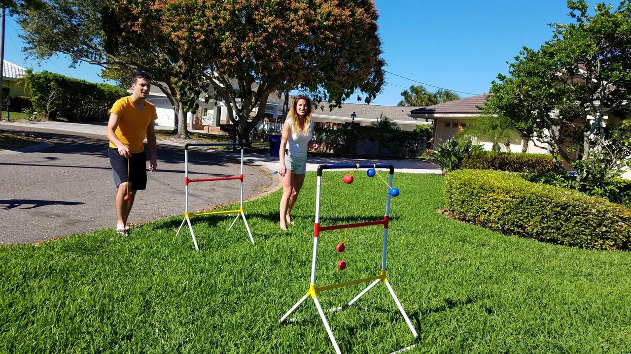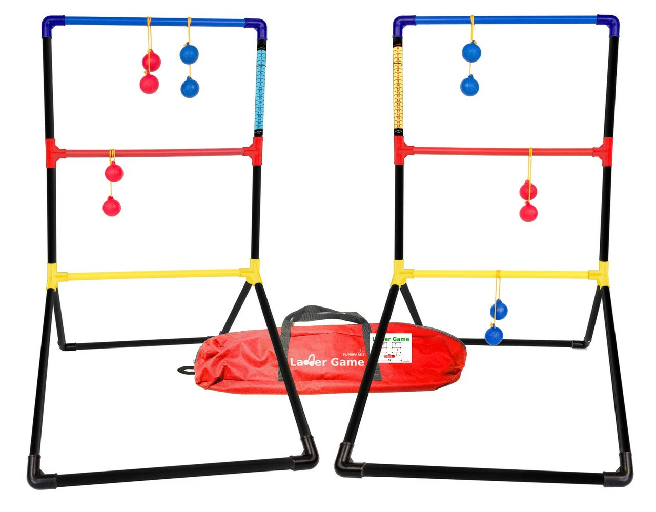Lightweight and Easy to Transport: The ladder golf set’s PVC piping and six bolas weigh very little all together, making it a convenient and practical game to bring along to any fun social gathering. Soft carry case Each bola consists of two balls (the same size and weight as golf balls) joined together by a string. Two upright targets, three blue bolas, and three red bolas are included in the ladder golf set.