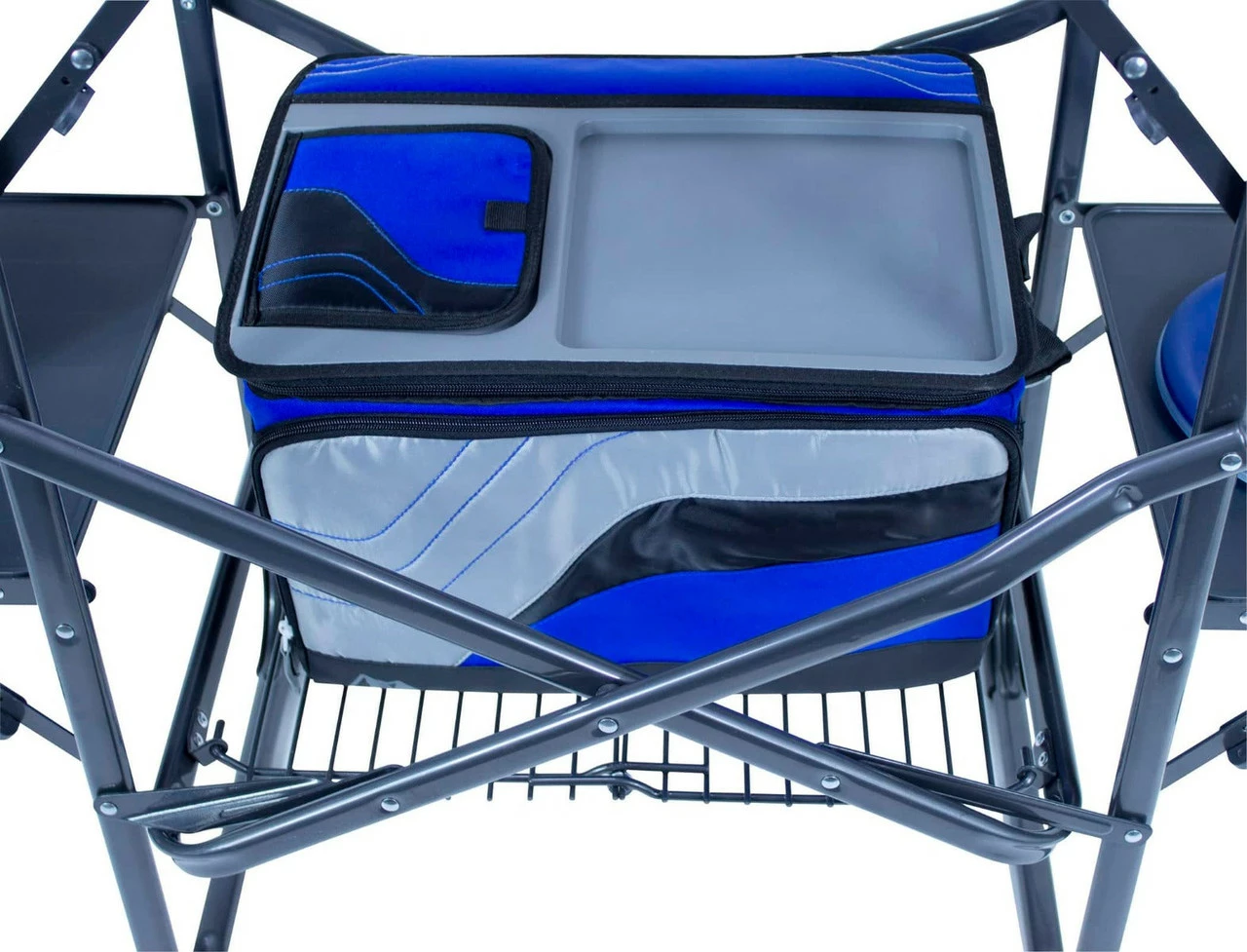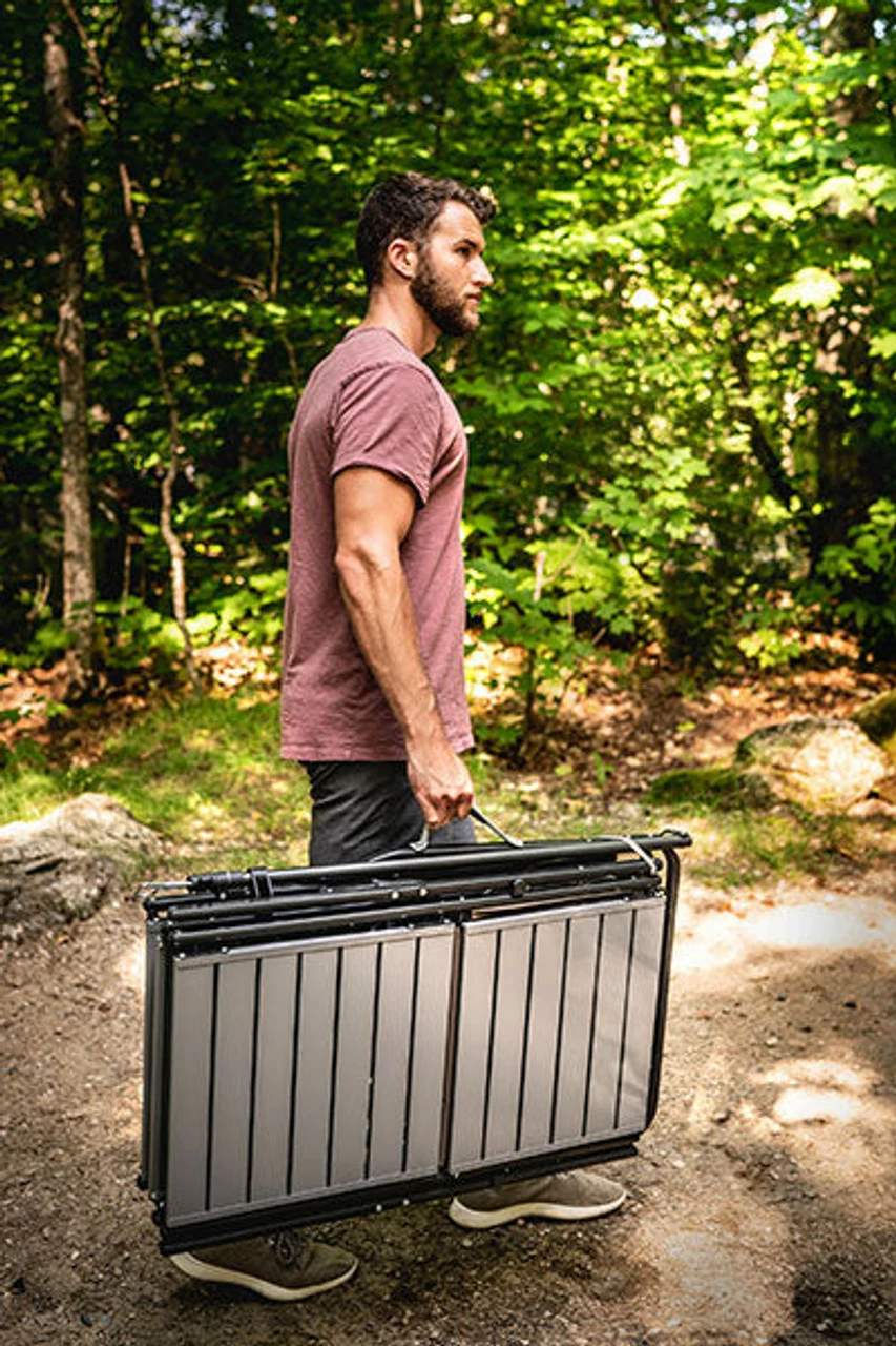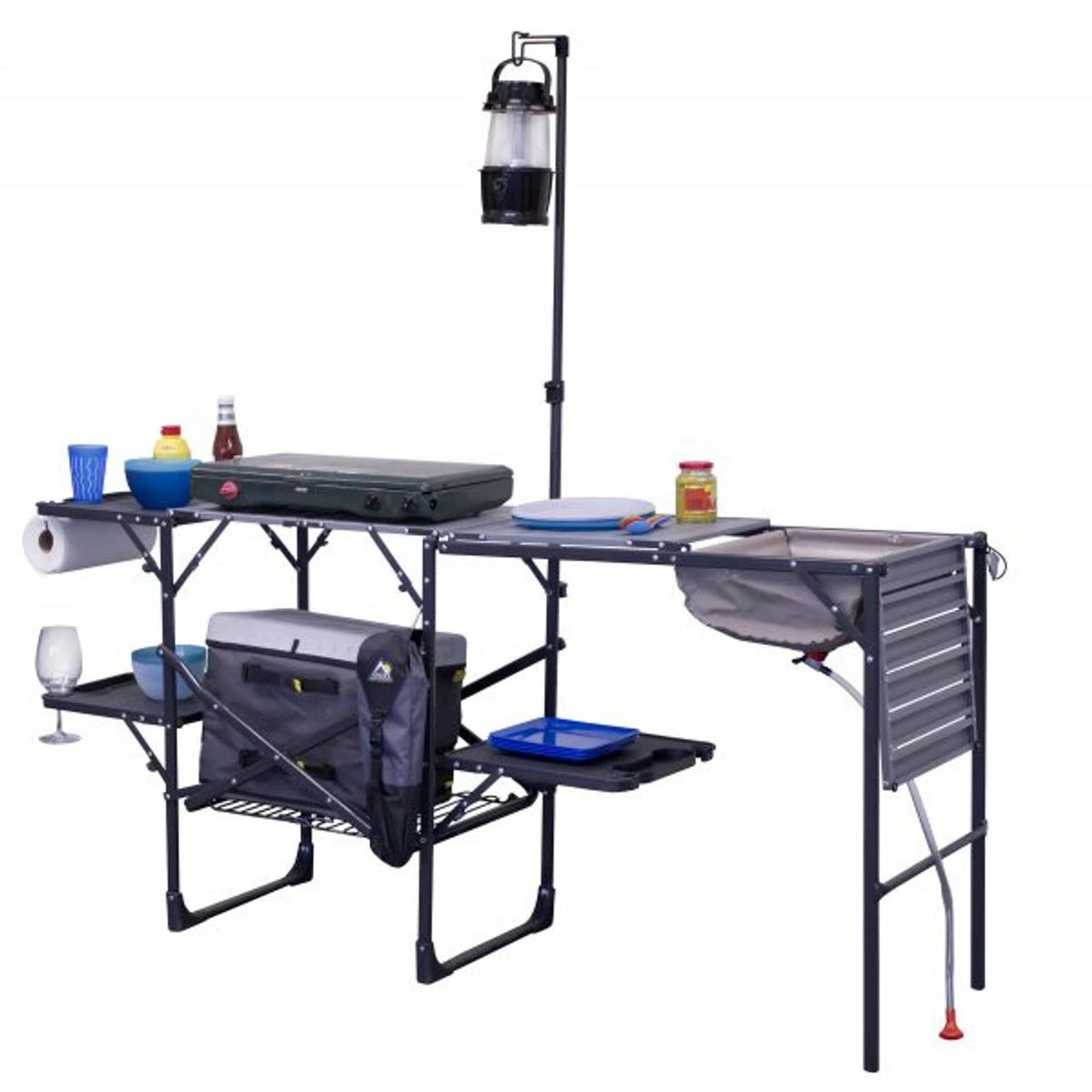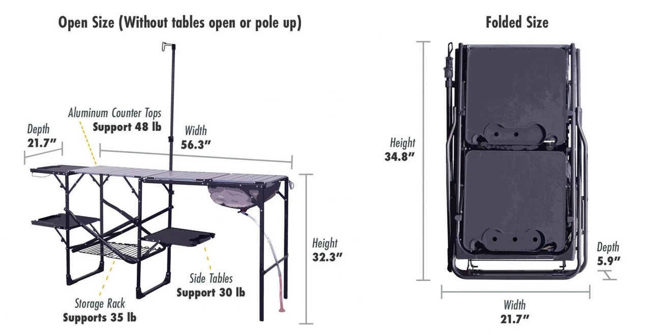This portable camp kitchen is packed with features (including a soft-shell sink!), making it the perfect addition to your tailgating or camping adventure. One piece, no hassle design Powder-coated steel frame Heat-resistant aluminum counter tops (weight limit: 48 lb/21.7 kg) Storage rack (weight limit: 35 lb/15.9 kg) 3 multi-use fold-out side tables – beverage, wine glass, garbage bag, paper towel and utensil holder (weight limit per table: 30 lb/13.6 kg) Telescoping lantern pole Soft-shell sink with drain