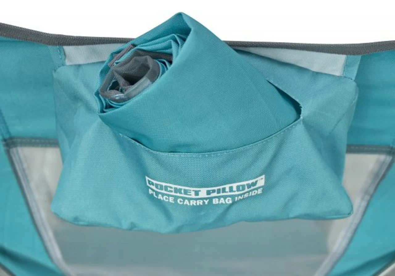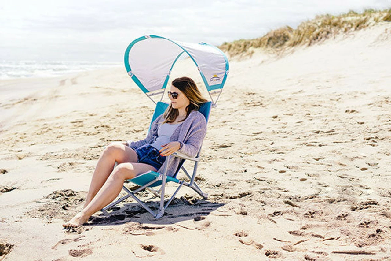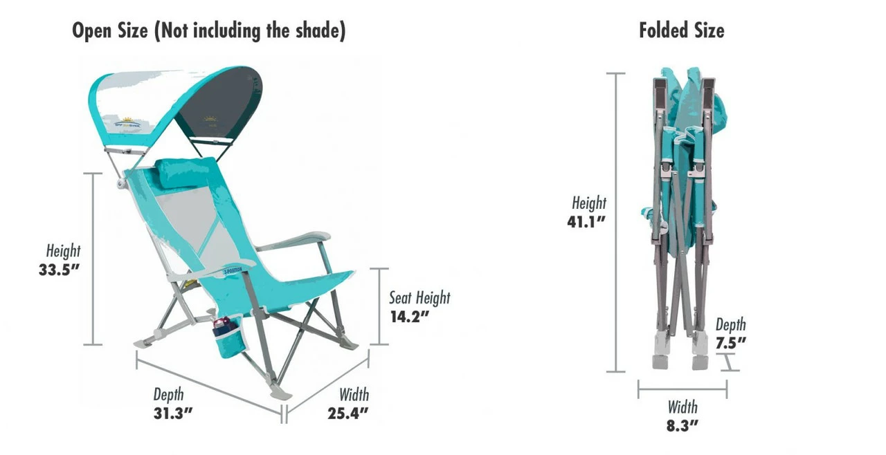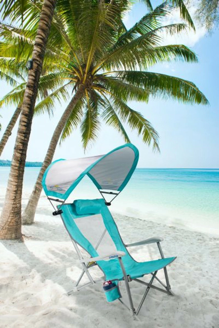 Sit back in this reclining beach chair with canopy, adjust it into one of three reclined positions, rotate the SunShade—and start relaxing! Easily folds up into a carry bag with built-in backpack straps. Locks, unlocks and folds easily with the Tension Bar Stability System™ 3 reclining positions Canopy Built-in beverage holder Breathable Polyester with a Mesh Backrest 50+ SunShade The carry bag rolls up to fit into the patent-pending Pocket Pillow™, converting it to a head pillow for additional comfort! Manufacturer's One Year Limited Warranty