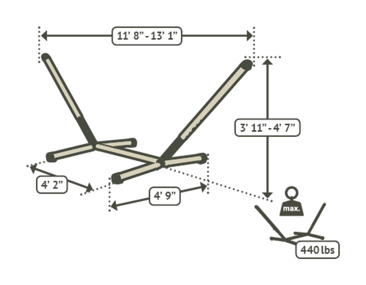 Hammock stands made of powder-coated steel tubes. Put it up ortake it down in a flash using the PlugTube System "“ simply connect the tubes until they click. Length:11 ft 8 in – 13 ft 1 in Height:3 ft 11 in – 4 ft 7 in Base Width:4 ft 9 in Carrying Capacity 440 lbs-Length:11 ft 8 in – 13 ft 1 in -Height:3 ft 11 in – 4 ft 7 in -Base Width:4 ft 9 in -Carrying Capacity 440 lbs -Powder-coated steel: durable and easy to clean.