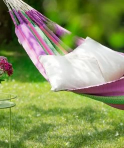 HamacTex¨ polypropylene fiber with doubled-weft threads is soft like cotton, and is UV, weather and water-resistant for lasting poolside enjoyment Striped design with purple, pink and white hues adds a beach-inspired look to any space Fabric is machine washable, so you can easily clean it before your next beach trip 440-lb weight capacity and mutiple cords support up to 3 people, allowing you to comfortably lounge outdoors with a companion Versatile design folds into a matching carrying bag for easy portability to your backyard, car or the beach Can be placed in your house or garden, on your balcony or between 2 trees (hanging straps sold separately) Suspension device must be installed by a professional and should be checked regularly for wear and tear 2-year limited warranty gives you peace of mind