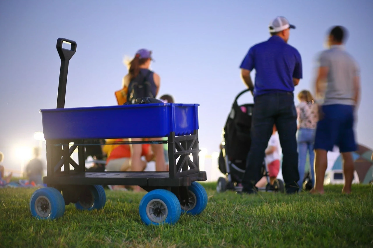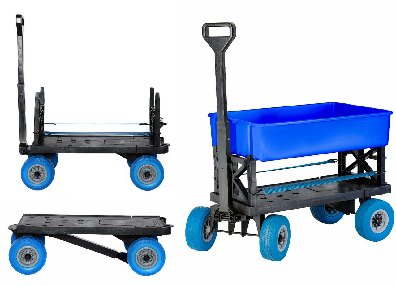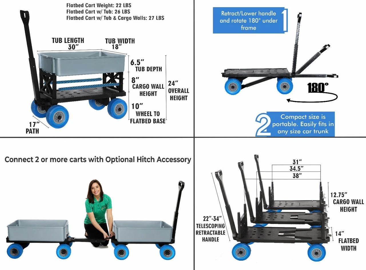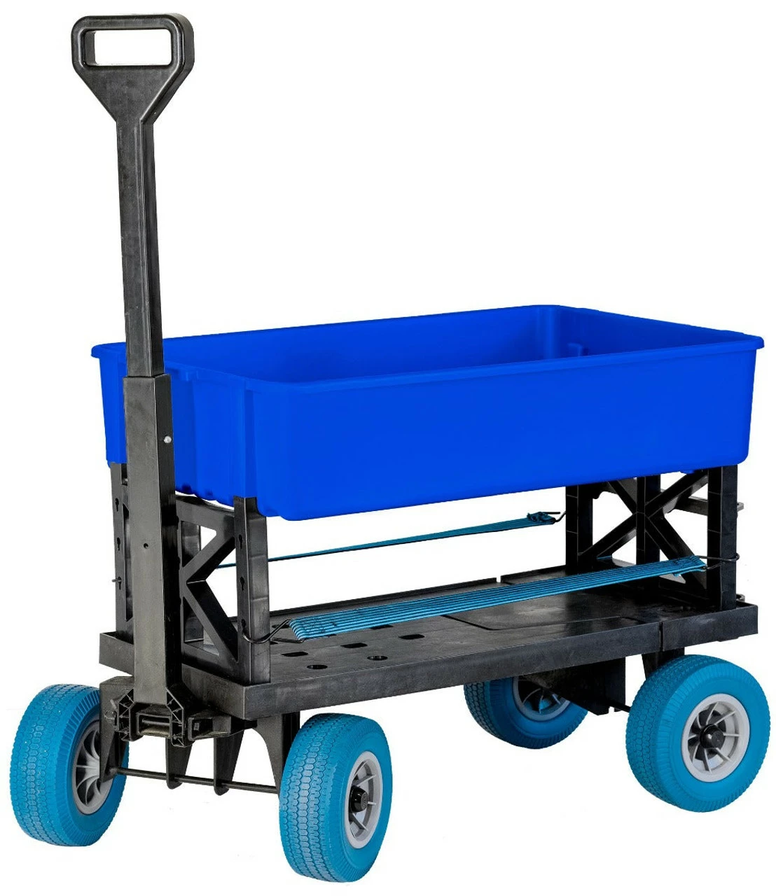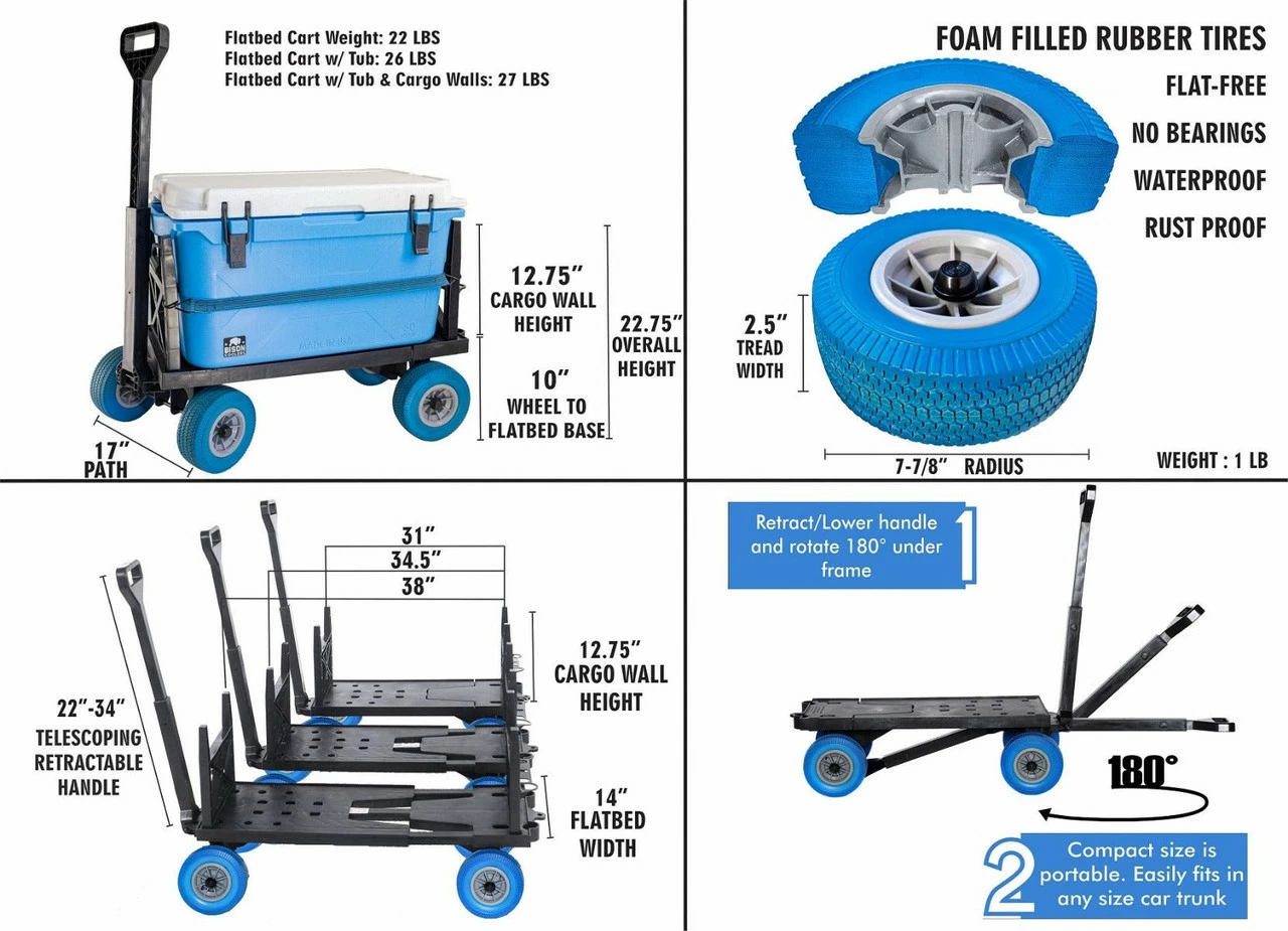 You get the most versatile cart created that can be used as a moving dolly, cooler cart, garden cart, dump cart, tool cart, gun range tactical cart or flatbed cart to haul all of your gear Your flatbed frame expands from 31" to 34" and again to 38" in length to fit your large and small coolers or large or small potted plants You get 4 solid multi-terrain solid rubber wheels that are airless, flat free and have no wheel bearings that can rust. Your equipment cart easily stores in your car trunk, bed of pickup or in the cargo bay of your SUV for easy transport You get a cart that is made from HDPP Resin which is weatherproof and will never rust or oxidize on you Your cart hauls up to 300 lbs on compact solid ground. What's Included with your order? (1) Expandable Flatbed with (4) Blue Non-Flat Solid Rubber Wheels (1) Tool Rack (Can hold 2 Tools or 2 Fishing Poles) (1) Blue Utility Tub (30" L x 18" W x 6" Deep) (2) Cargo End Walls (2) Bungee Cords (2) Fishing Pole Holders