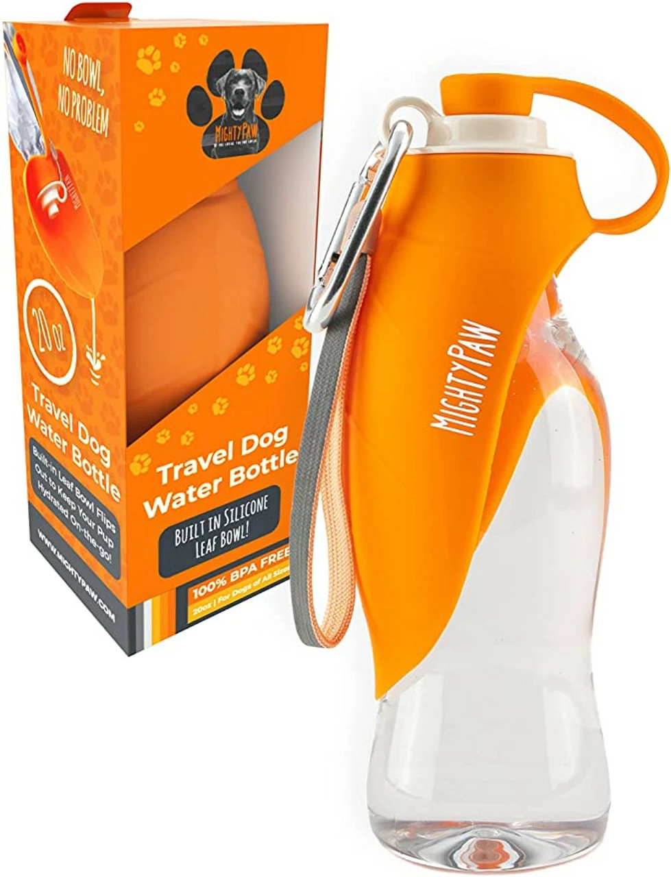 Mighty Paw"™s modern and stylish Travel Dog Water Bottle is made with BPA-free, food-grade silicone that"™s free from harmful chemicals. That makes it perfectly safe for your pup to drink from it! Our reusable travel dog water bottle holds 20 oz of water (590 ml). That makes it perfect for even the thirstiest of pups, small or large! 100% BPA-free, food-grade silicone leaf & bottle Safe to drink while hiking and walking Reusable water bottle Gentle on the environment Leak-proof silicone nozzle cover Prevents messes Soft wrist strap Carry the bottle yourself Durable carabiner clip Clip it to your pup"™s harness or to your backpack Top-rack dishwasher safe Easy to clean Available in 2 bright colors: Orange and Green Holds 20 oz of water Great size for small, medium and large pups