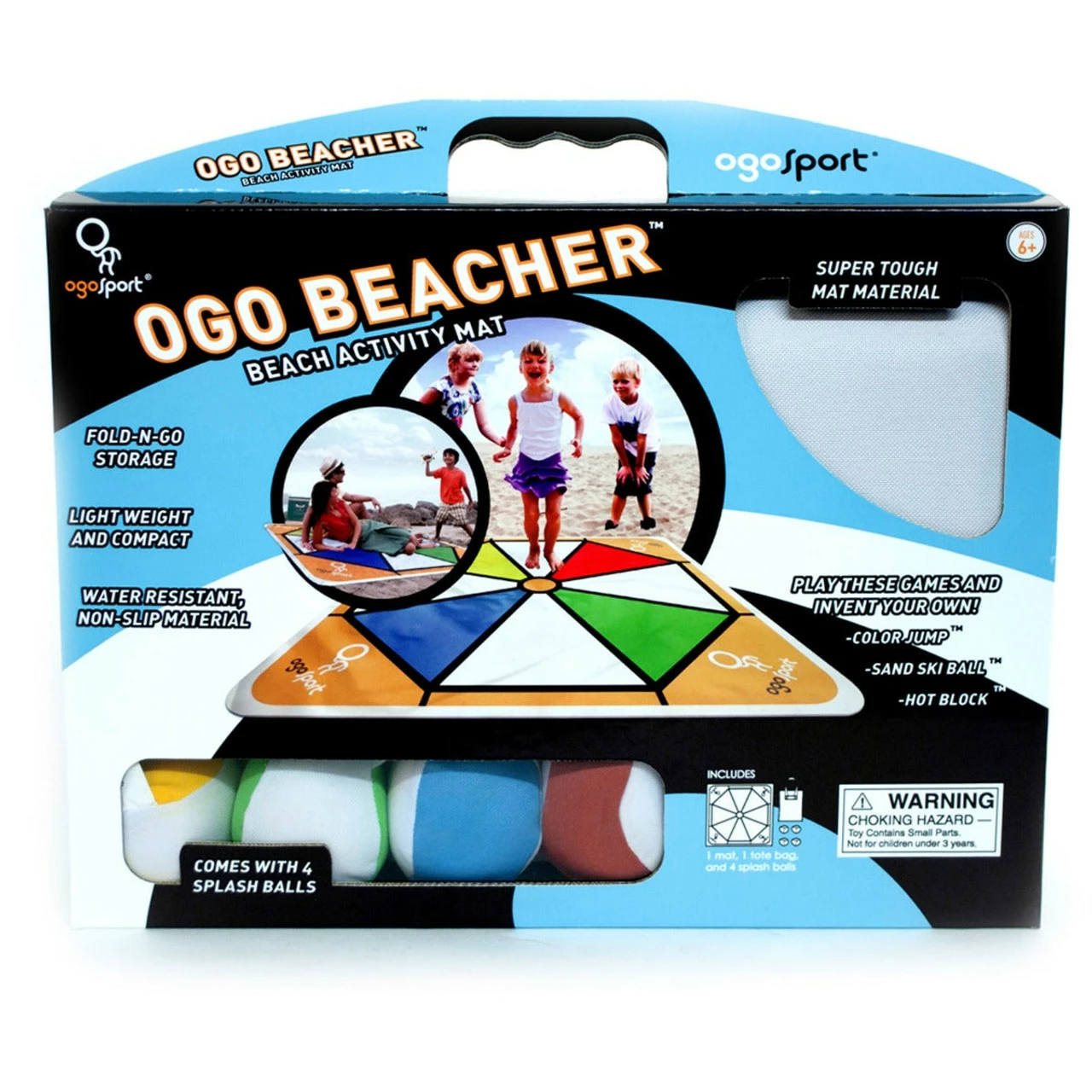 Beach blanket with built-in games Contains a heavy-duty canvas mat with game graphics, carrying tote bag and 4 Ogo splash balls for playing games Water-resistant coating keeps everyone dry while sitting on the ground Mat graphics allow for creation of new games WARNING: CHOKING HAZARD "” Small parts. Not for children under 3 yrs. Beach blanket with built-in games! Can be used inside in a playroom, outside in the yard or at the beach! Contains a heavy-duty canvas mat with game graphics, carrying tote bag and four Ogo splash balls for playing games. Water-resistant coating keeps everyone dry while sitting on the ground. Comes with three game ideas or invent your own!