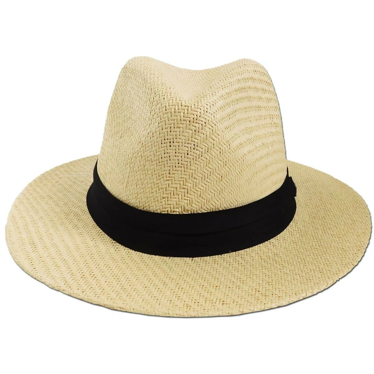 Crafted out of a toyo straw material 3-pleat cotton ribbon hat band, signature metal logo badge, inner sweatband liner, and a 2 1/2" structured big brim for ultimate sun protection UVA/UVB Protection Breathable, lightweight material Teardrop pinched crown and inner sweatband, this unisex beach hat is conveniently designed for men and women to ensure maximum comfort