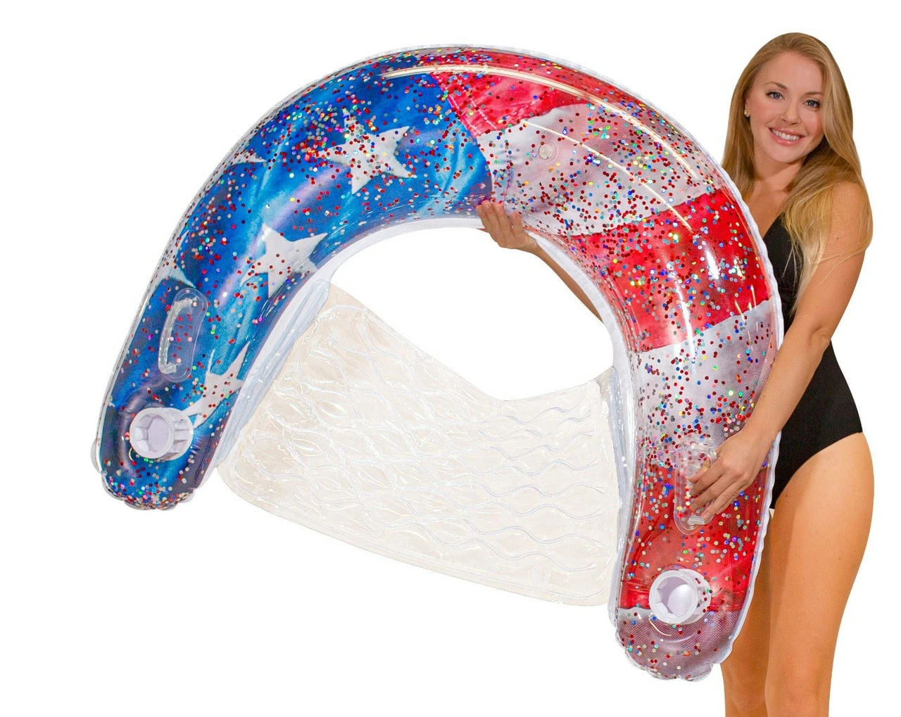 Shine bright in the water with this patriotic sun chair! Features Contains reflective glitter. Made from PVC Designed for both kids and adults Made in the USA.