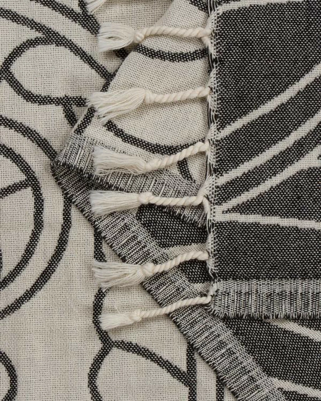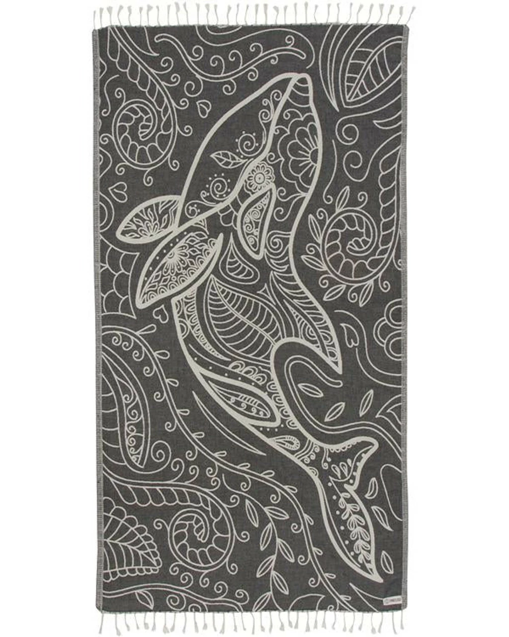 Approx 36" x 68" Color: Black Towel Weight: 360 gsm 100% Turkish Organic Cotton Sand Resistant Design! Made and Loomed in Turkey Single weave jacquard Twisted tassel fringe A portion of the proceeds go towards marine conservation. Care Details Machine wash on delicate or gentle using cold water with like colors. Best practice hang to dry. Tumble dry low also acceptable. Do not use Bleach, Fabric Softners, and Dryer Sheets.