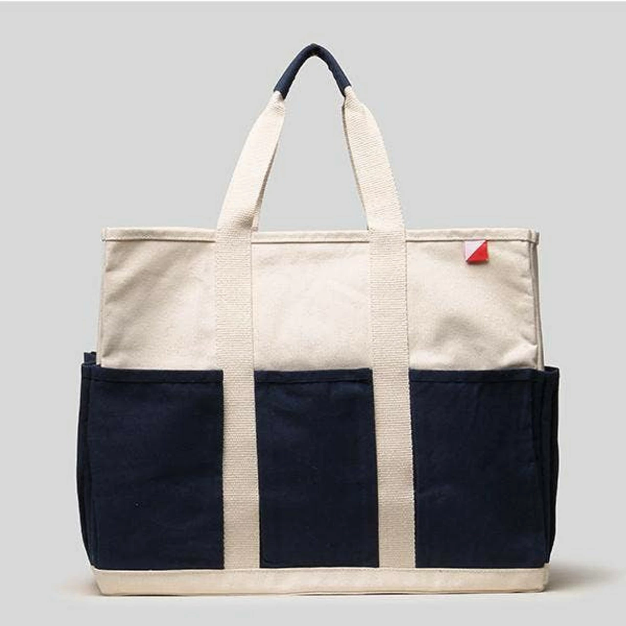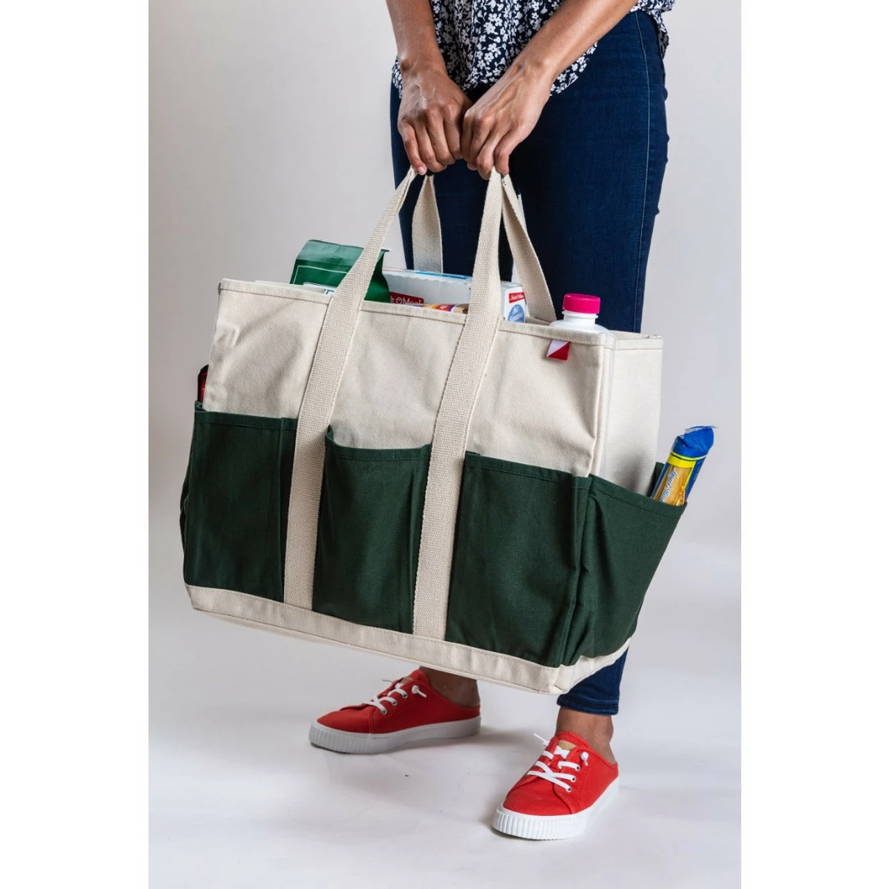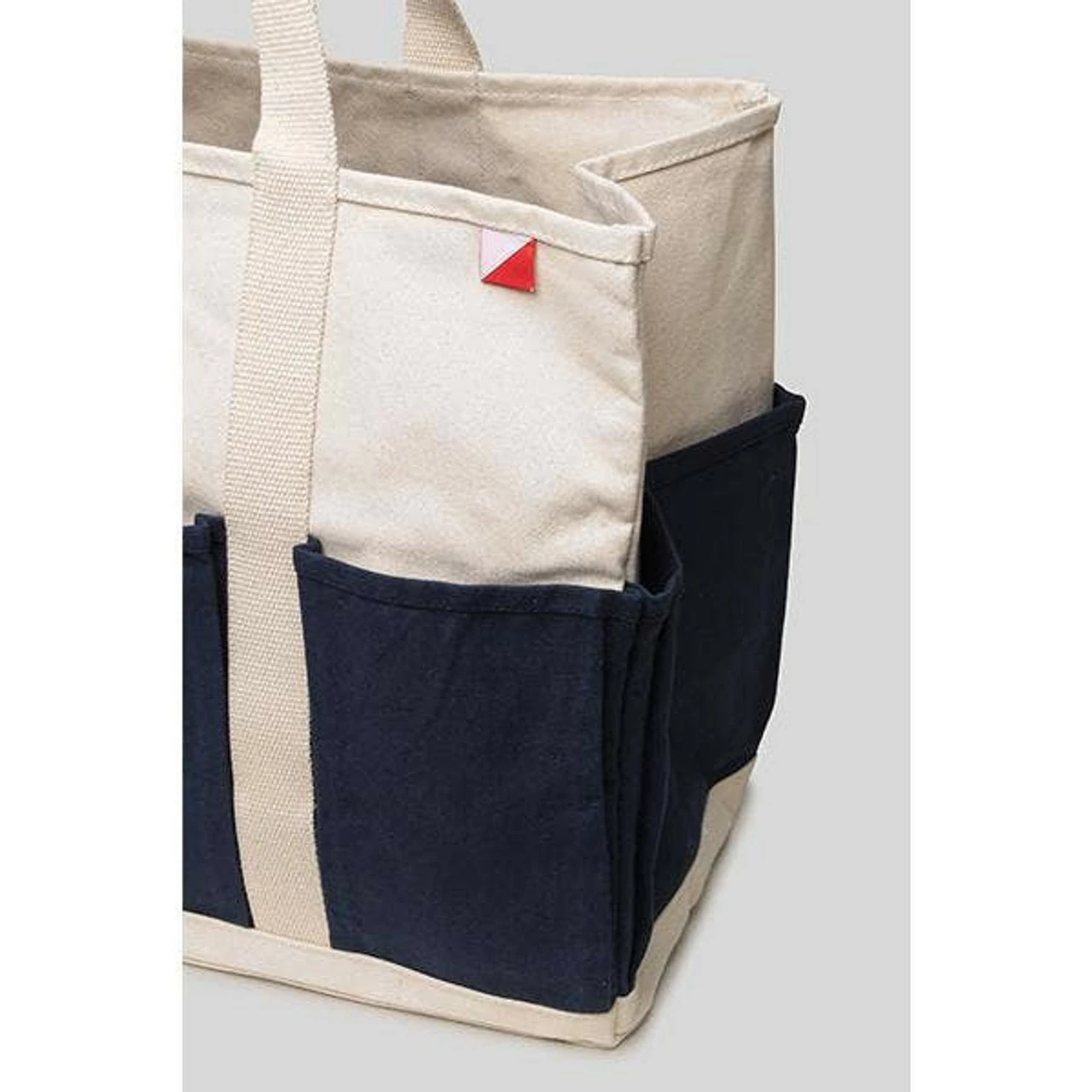 This durable heavy canvas and sturdy construction give these totes a versatile functionality and ability to stand up to the heaviest loads. You'll find countless uses for this large multiple-pocket work bag from crafting, gardening, school supplies or traveling. Crafted from eco-friendly, heavyweight cotton canvas 8 external gusseted pockets, each 8 1/2" high for loads of organization Cotton webbing handles with colored cotton grip Dimensions: 19" x 15" x 9"