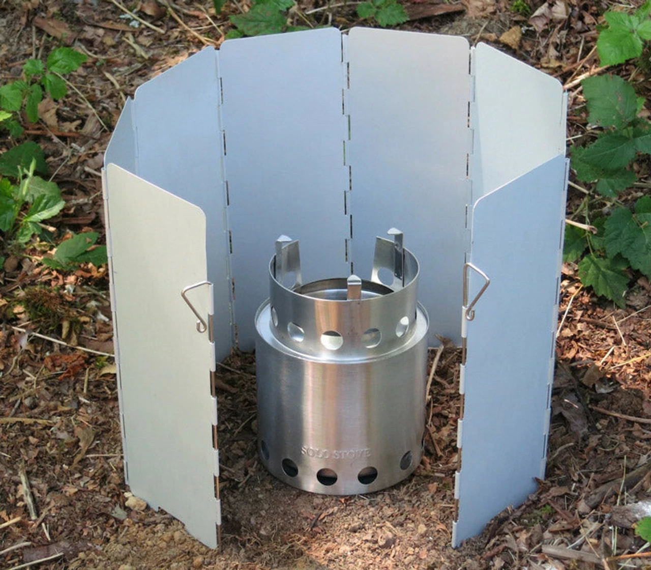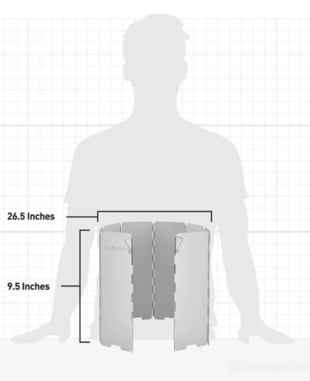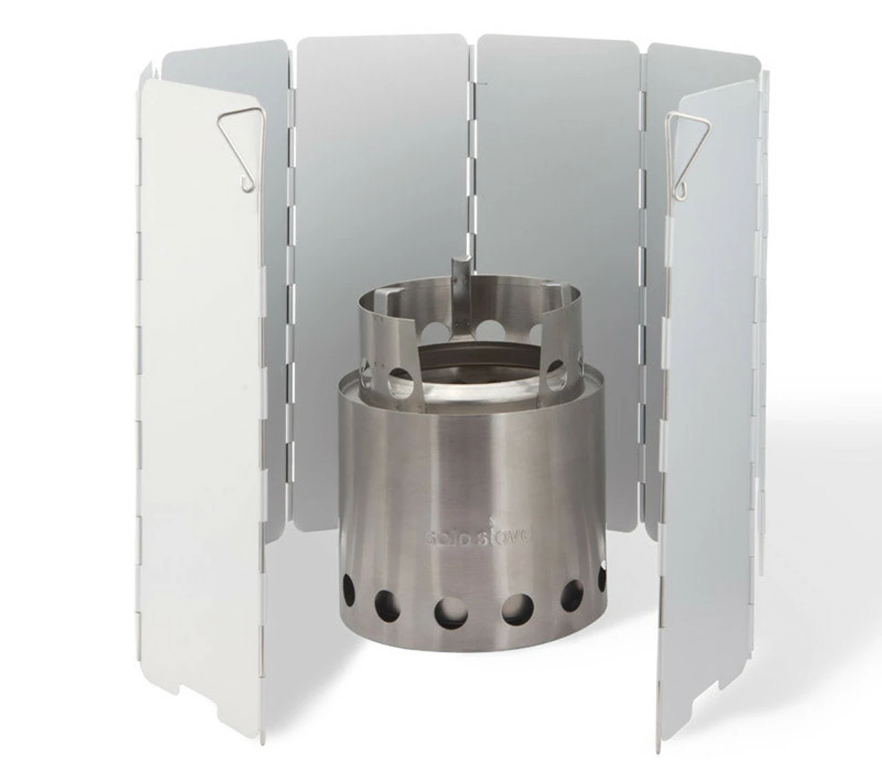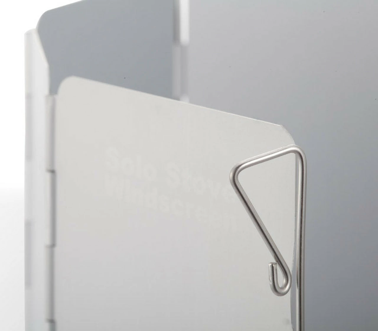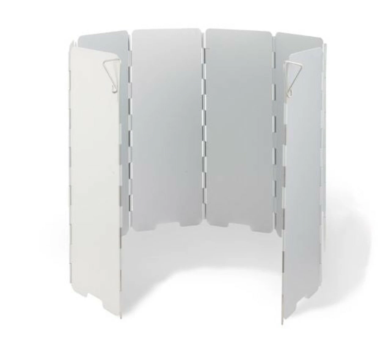 Windscreen is the ultra portable solution to protecting your camp stove"™s flame. Product Specs MATERIALS Anodized Aluminum FEATURES Extendable ground pegs for stability WEIGHT 7.4 oz The folding, eight-panel design lets you configure it to the right shape. The Windscreen fits perfectly to the terrain. It"™s extendable ground pegs and eight-panel design allow you to configure it to the right angle around your camp stove. When you"™re ready to get moving it folds right up and stores in the included stuff sack. Made of lightweight anodized aluminum