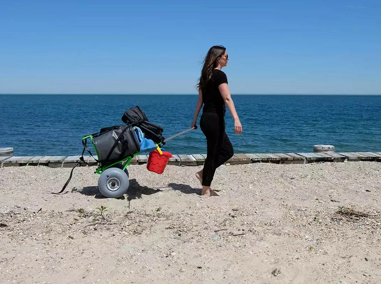The WheelEEZ® Folding Beach Cart travels across the sand like a breeze, the folds up for easy storage. Carry everything in one trip – no need for multiple trips back to your vehicle or house! Note: new color for 2021 – Sky Blue(not available in greeen) Weight: 18 lbs (8.2 kg) Payload capacity: 165 lbs (75 kg) Platform dimensions: 14.5 x 14'' (36.8 x 35.6 cm) Width including wheels: 29.5''(74.9 cm) Width Folded – frame & wheels: 29 x 15 x 12'' (73.7 x 38.1 x 30.5 cm) Handle height: 29'' to 49'' (73.7 to 124.5 cm) Detachable 30 cm polyurethane beach wheels Material: Tubular steel Finish: Epoxy powder coated Includes tie down straps and elastic band WheelEEZ® Beach Cart-Folding WZ1-BCF specifications: Weight: 16 lbs – Payload capacity: 165 lbs (75 kg) Platform dimensions: 14.5 x 14'' (36.8 x 35.6 cm) Width including wheels: 29.5''(74.9 cm) – Folded – frame & wheels: 29 x 15 x 12'' (73.7 x 38.1 x 30.5 cm) Handle height: 29'' to 49'' (73.7 to 124.5 cm) Detachable 30 cm polyurethane beach wheels Material: Tubular steel Finish: Epoxy powder coated